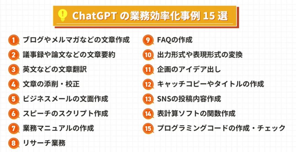 ここからは、ChatGPTを業務で活用できる15のシーンを具体的に紹介していきます。各事例にはすぐに使えるプロンプト例も掲載しているので、自社の業務に合わせてカスタマイズしてみてください。
