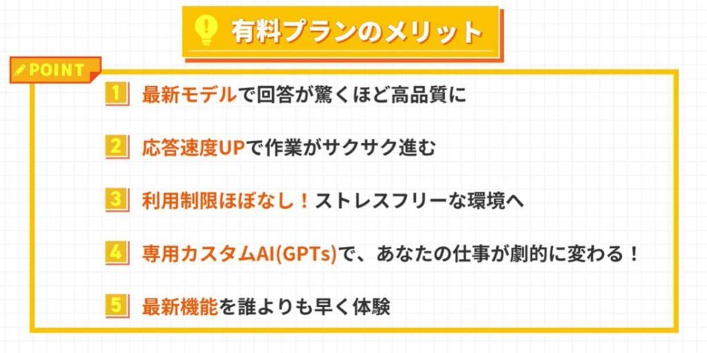 6つの違いを踏まえ、ChatGPTの有料プラン(Plus)を業務で使うと具体的にどんなメリットが得られるのかを5つの視点で掘り下げます。