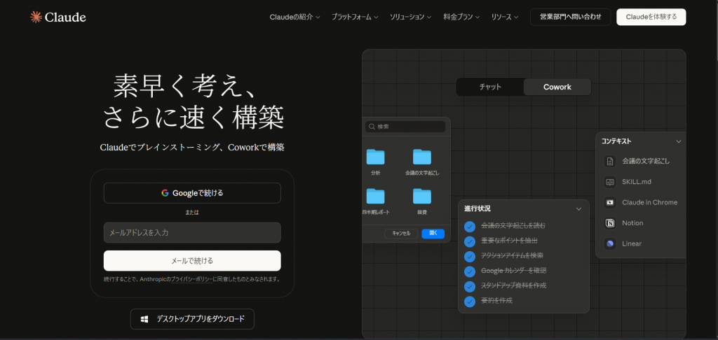 Anthropic社が開発したClaudeは、自然で読みやすい日本語の生成能力に定評があるAIアシスタントです。ビジネスメール、ブログ記事、報告書など、文章品質が重視されるタスクではChatGPTと並ぶ、あるいは凌駕する実力を備えています。