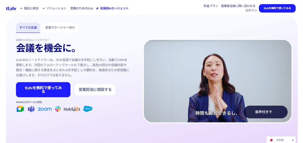 tl;dv(Too Long; Didn’t View)とTacticは、オンライン会議の録画・文字起こし・要約をワンストップで自動化するAIツールです。Zoom、Google Meet、Microsoft Teamsなど主要なビデオ会議ツールと連携し、会議開始と同時に録画と文字起こしが自動的にスタートします。