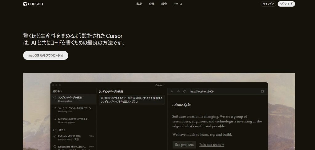 Cursorは、AI機能を深く統合した次世代のコードエディタです。Visual Studio Code(VS Code)をベースに開発されており、VS Codeの拡張機能やキーバインドをそのまま引き継げるため、既存の開発環境からスムーズに移行できます。