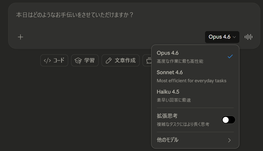 複雑な思考や本格的なコーディングには最上位「Opus」を活用