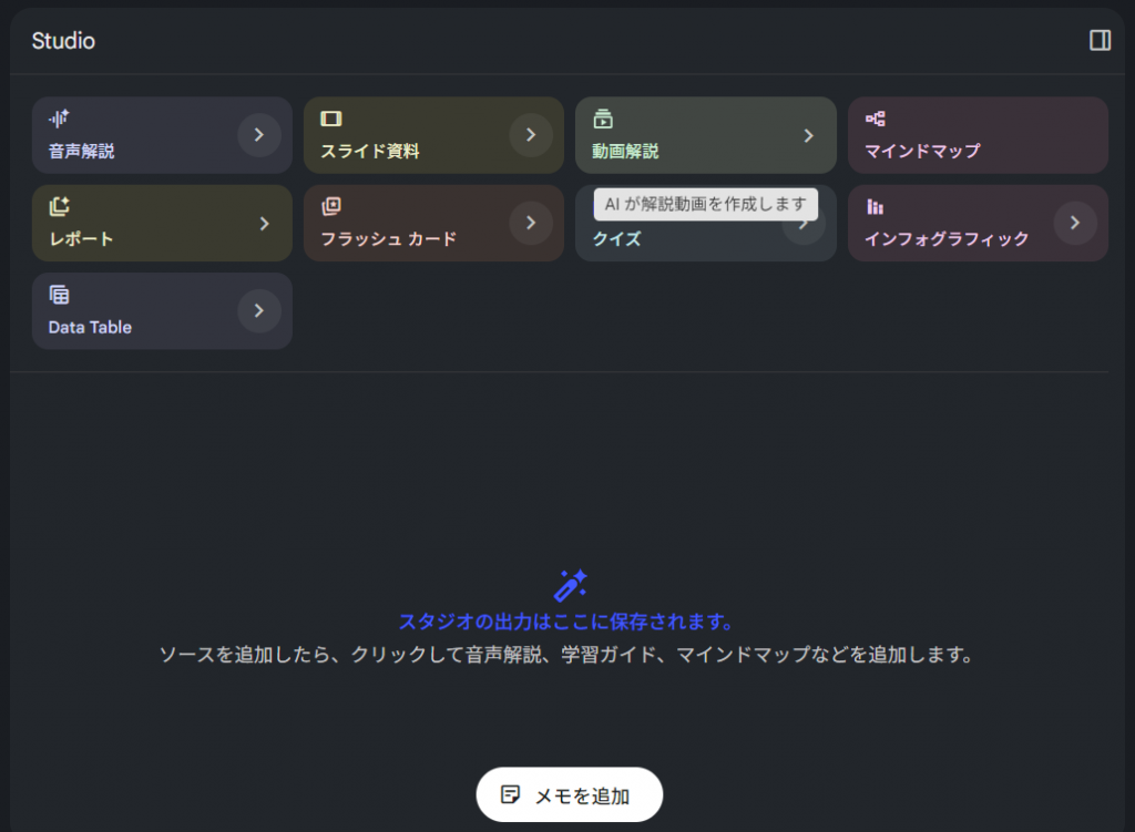 ソースの登録が完了したら、画面右側のStudioパネルから「動画解説」を選択します。