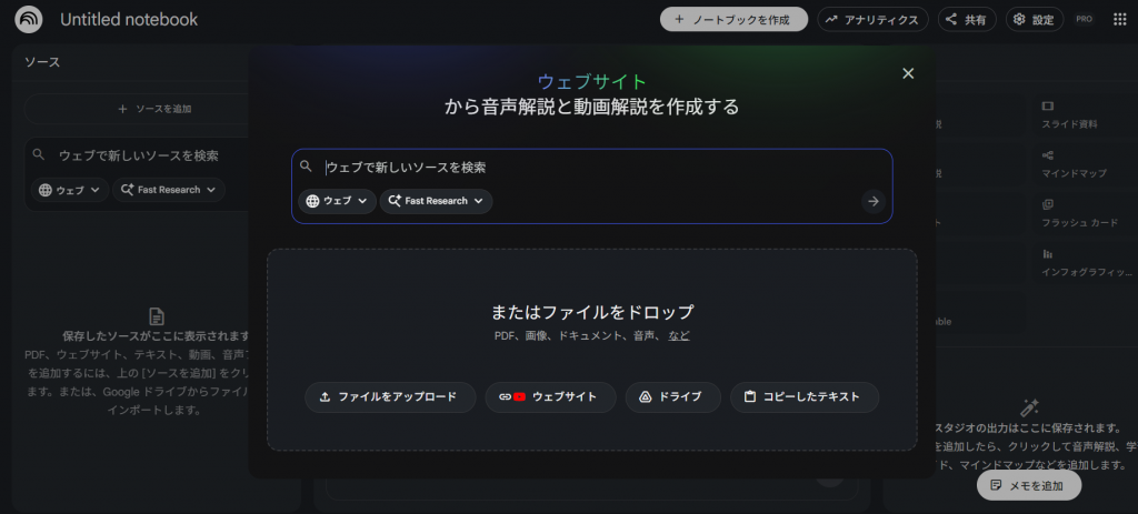 1. 新規ノートブックを作成しソース(資料・URL等)をアップロードする