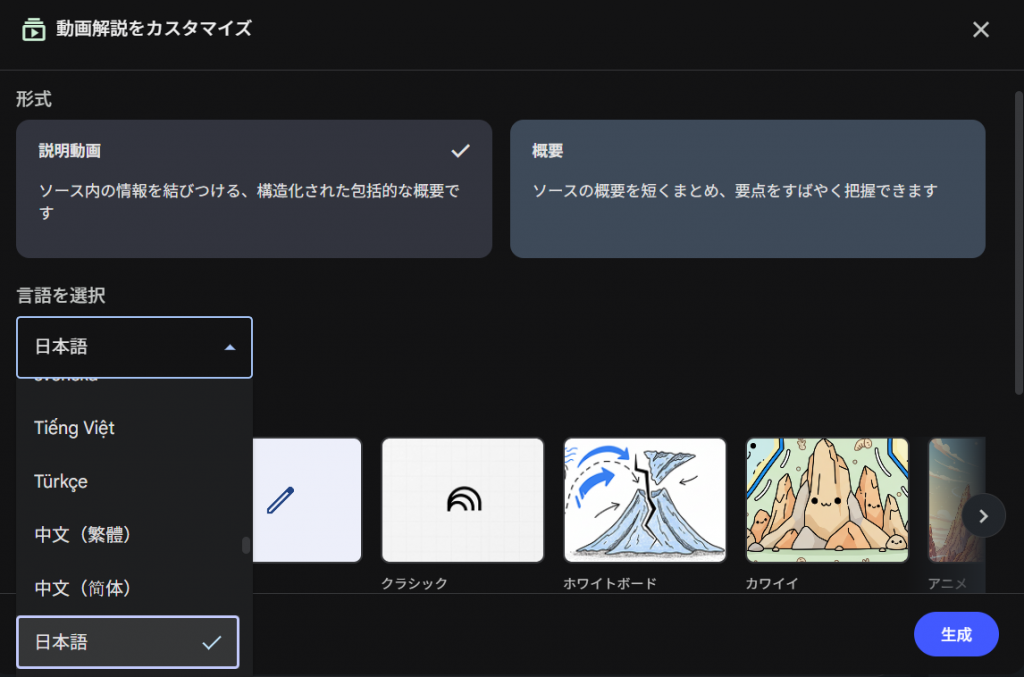 Googleアカウントの言語設定が日本語になっていれば、デフォルトで日本語の動画が生成される仕様です。