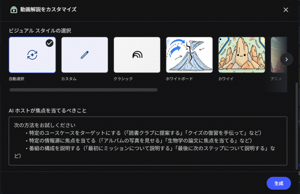 たとえば「初心者向けに専門用語を使わず解説して」と入力すれば、平易な言葉を使った動画が生成されるでしょう。